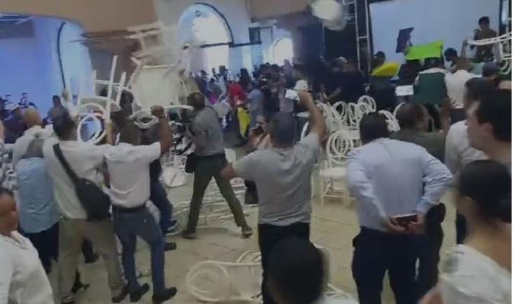 Apatzingán, Mich., a 26 de abril de 2025.-Un grupo de hombres y mujeres desconocidas armaron una trifulca en una asamblea informativa liderada por el senador Raúl Morón Orozco, en un salón de un hotel de Apatzingán.