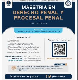 Morelia, Mich., a 22 de agosto de 2023.- La Fiscalía General del Estado de Michoacán (FGE), a través del Instituto de Capacitación convoca al personal que integra las instituciones de Seguridad Pública y de Procuración de Justicia, personal académico, investigadores, abogadas y abogados postulantes que desean ampliar o profundizar sus conocimientos y destrezas en el campo del Derecho Penal a participar en el proceso de admisión e ingreso para cursar la Maestría en Derecho Penal y Procesal Penal.