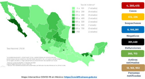 Ciudad de México, a 17 de enero de 2022.-México reportó 17 mil 101 nuevos casos de covid-19 en las últimas 24 horas con los que acumula 4 millones 385 mil 415.
