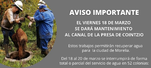 Cabe resaltar que estos trabajos de limpieza se programan cada año debido a que el agua proveniente de la presa arrastra material que va saturando el canal, reduciendo poco a poco su capacidad y dificultando el recorrido del agua hacia la planta donde se realiza el proceso de potabilización para garantizar la calidad del agua que se entrega a los hogares morelianos. Se prevé que a partir del lunes 21 de marzo quede normalizado el servicio.
