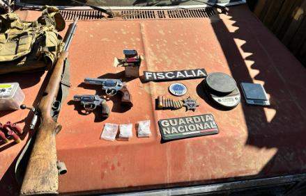 Morelia, Mich., a 17 de enero de 2024.-Resultado de un cateo llevado a cabo en el municipio de Huiramba, la Fiscalía General del Estado de Michoacán (FGE), en coordinación de la Guardia Nacional (GN), aseguró armas, sustancia con características de narcótico y tres vehículos con reporte de robo y alteraciones en sus medios de identificación; hay dos personas detenidas.