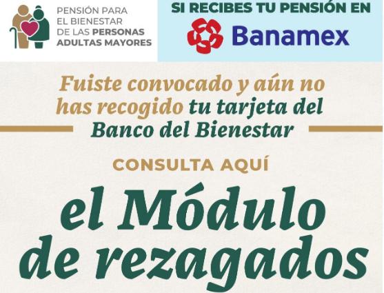 En el país están a disposición 464 Módulos de Bienestar para rezagados; brindan atención de lunes a sábado de 10 de la mañana a 4 de la tarde para entregar la tarjeta del Banco del Bienestar. Es muy importante recogerla antes del 15 de marzo para continuar recibiendo la pensión de manera oportuna.