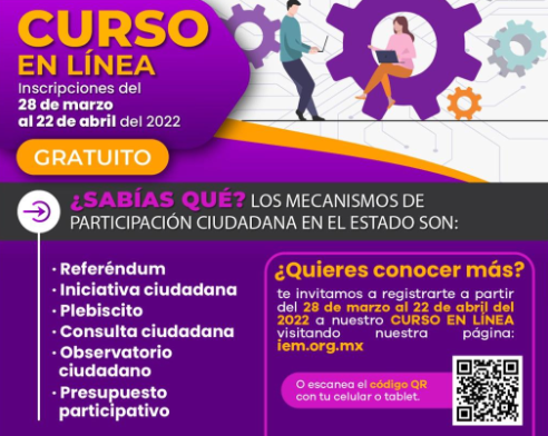Morelia, Mich., a 20 de abril de 2022..Con la finalidad de que la ciudadanía michoacana conozca los mecanismos de participación con los que pueden incidir de manera directa en la toma de decisiones de los órganos de gobierno encaminadas al bien común, el Instituto Electoral de Michoacán (IEM) abrió el registro para el Curso en Línea sobre “Mecanismos de Participación Ciudadana en el estado de Michoacán”.