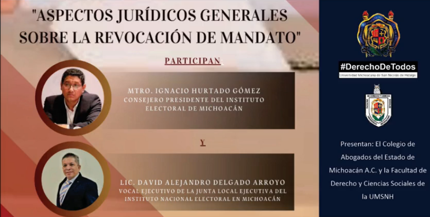 Morelia, Mich., a 29 de marzo de 2022.-Con el objeto de brindar a la ciudadanía la información necesaria sobre el ejercicio de consulta que se desarrollará el próximo 10 de abril, se llevó a cabo el foro “Aspectos Jurídicos Generales sobre la Revocación de Mandato”, organizado por el Colegio de Abogados en Michoacán A.C. y la Facultad de Derecho y Ciencias Sociales de la Universidad Michoacana de San Nicolás de Hidalgo (UMSNH).