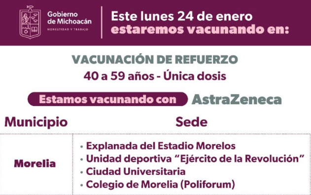 Morelia, Mich., a 22 de enero de 2022.-El próximo lunes operarán en Morelia cuatro macromódulos de vacunación anticovid, con el propósito de atender a mayor número de ciudadanos con la aplicación de la dosis de refuerzo a michoacanos de 40 a 59 años.