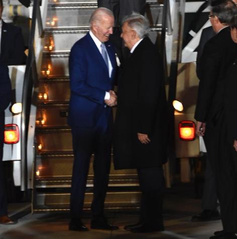 Ciudad de México, a 8 de enero de 2023.-En medio de un impresionante operativo de seguridad en el Aeropuerto Internacional Felipe Ángeles, en el Estado de México, el presidente Andrés Manuel López Obrador dio la bienvenida al mandatario estadunidense Joe Biden, esta noche que inicia su primera gira oficial por nuestro país, en el marco de la X Cumbre de Líderes de América del Norte.