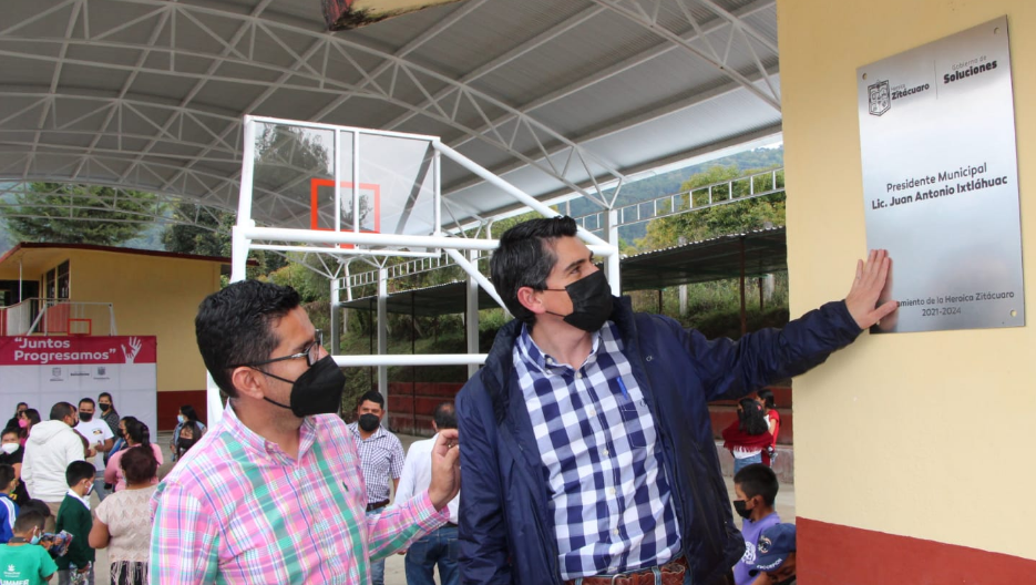 Zitácuaro, Mich., a 20 de enero del 2022.-En gira de trabajo por la tenencia de Aputzio de Juárez, el alcalde Toño Ixtláhuac hizo entrega de una techumbre y la habilitación de una cancha de usos múltiples en la escuela primaria Revolución Campesina, en la comunidad de La Troje, para beneficio de 300 estudiantes.