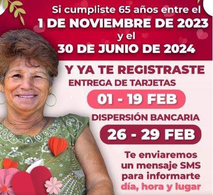 Ciudad de México, a 28 de enero de 2024.-La secretaria de Bienestar, Ariadna Montiel Reyes, invita a las personas adultas mayores que cumplieron 65 años entre el 1° de noviembre de 2023 y el 30 de junio de 2024, y se registraron a la Pensión para el Bienestar, a que permanezcan atentos a la convocatoria para recibir la Tarjeta de Bienestar, que se realizará a través mensaje de texto que recibirán vía SMS informando día, hora y lugar para recogerla.