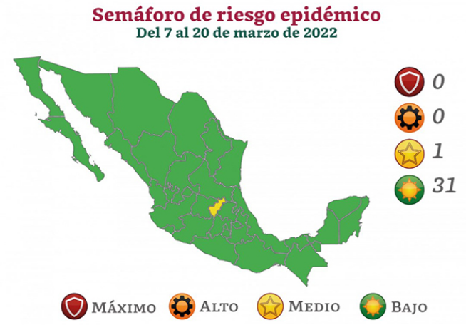 Ciudad de México, a 4 de marzo de 2022.-Las próximas dos semanas, 31 de las 32 entidades del país estarán en verde en el Semáforo de Riesgo Epidémico de la Secretaría de Salud Federal, así que disminuyó el riesgo de contagio de Covid-19.