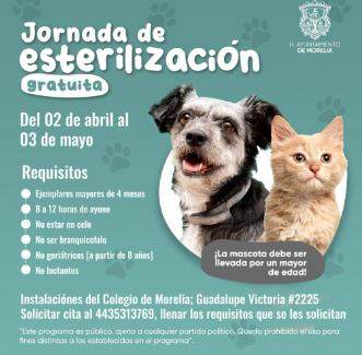 Morelia, Mich., a 4 de abril de 2024.-El Gobierno de Morelia invita a la ciudadanía en general a participar en la Jornada de Esterilización que se realizará del 02 de abril al 03 de mayo, en las instalaciones del Colegio de Morelia.