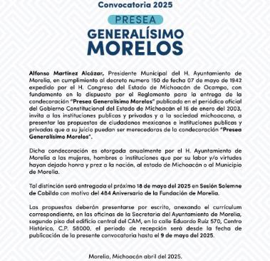 Morelia, Mich., a 22 de abril de 2025.-El Gobierno de Morelia encabezado por el presidente municipal, Alfonso Martínez Alcázar, invita a la sociedad a participar en la convocatoria a la Presea Generalísimo Morelos 2025, que busca reconocer a morelianas y morelianos por su valiosa aportación a nuestra ciudad, estado y nación.