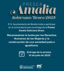 Morelia, Mich., 11 de junio de 2025. –El Gobierno de Morelia, a través de su Secretaría de la Mujer Moreliana para la Igualdad Sustantiva (Semmujeris), convoca a la ciudadanía a postular a la Presea “Amalia Solórzano Bravo” a aquellas ciudadanas o instituciones que se hayan distinguido por su trabajo a favor de los derechos de las mujeres y la construcción de una sociedad igualitaria.