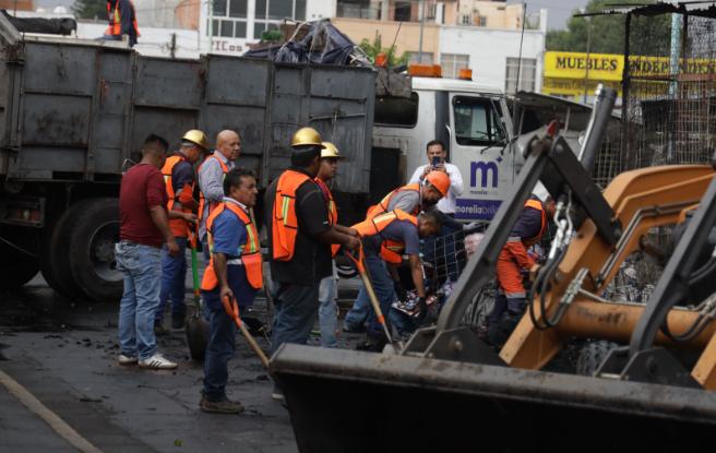 Dos grupos de trabajo de la Secretaría de Servicios Públicos, apoyados con 5 camiones de volteo y limpia, además de 2 retroexcavadoras, son las que realizan las acciones de recolección de mercancía dañada por el siniestro que afectó la parte del mercado sobre las calles Ana María Gallaga y Andrés del Río.