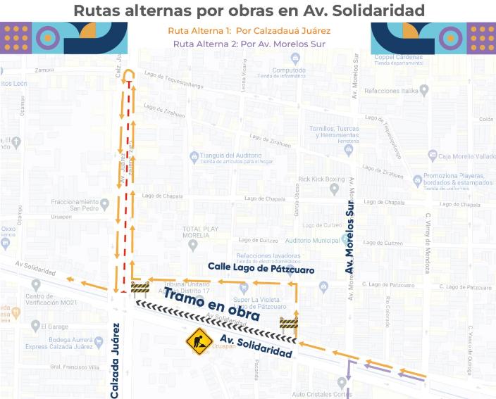 El cierre de la vialidad se realizará el próximo miércoles 21 de septiembre a partir de las 8:00 horas, por lo qué la Secretaría de Desarrollo Urbano y Movilidad recomienda transitar por la calle de Lago de Pátzcuaro hasta calzada Juárez, continuar hacia la derecha hasta la calle de Lago de Tequesquitengo y retornar hasta reincorporarse en Av. Solidaridad.