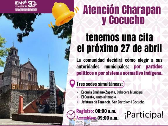 La consulta se realizará de forma simultánea en tres sedes: en la cabecera municipal de Charapan, en la Escuela Emiliano Zapata; y en dos puntos de la Tenencia de San Bartolomé Cocucho: el Curato, ubicado junto al templo principal, y el portal de la Jefatura de Tenencia, en el centro de la comunidad.