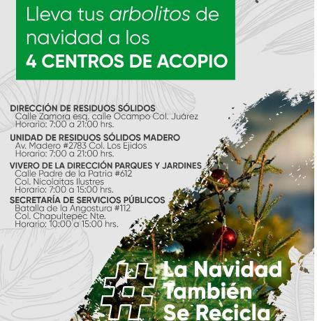 “Lo que se hace con este arbolado es que se tritura y se convierte en composta que después usamos en Parques y Jardines o también lo entregamos a la ciudadanía para que se esparza en plantas, suelos y demás; por lo que con la misma ilusión con la que compraron su arbolito, invitamos a la ciudadanía a llevarlo a los centros de acopio y garantizar con ello un tratamiento para poder reintegrarlo a la naturaleza como composta”, comentó Vázquez Vargas.