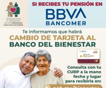 Señaló que el cambio de tarjeta se realizará entre el 27 de marzo y el 30 de abril, las personas derechohabientes deberán consultar con CURP en mano en la página oficinal: https://www.gob.mx/bienestar?tab=pbpam, día, hora y lugar en que habrán de presentarse para recoger la tarjeta del Banco del Bienestar. Mientras se realiza el cambio, seguirán recibiendo la pensión en la tarjeta actual.