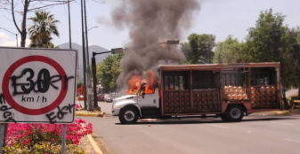 Morelia, Mich., a 6 de abril de 2026.-Un grupo de pobladores de la comunidad indígena de Arantepacua han causado destrozos en esta capital, durante su movilización a las instalaciones de la Fiscalía General del Estado, a las del INFONAVIT, de la SEE y han quemado varias unidades de empresas privadas.