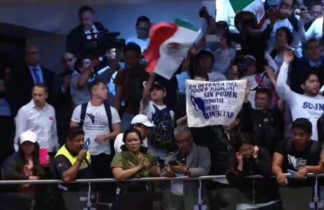 El equipo de seguridad advirtió al pleno hasta que Noroña suspendió por el momento esta discusión, las personas que ingresaron usan playeras blancas con la leyenda Poder Judicial. Al entrar al recinto, el personal de seguridad lanzó líquido de extintores a los manifestantes.