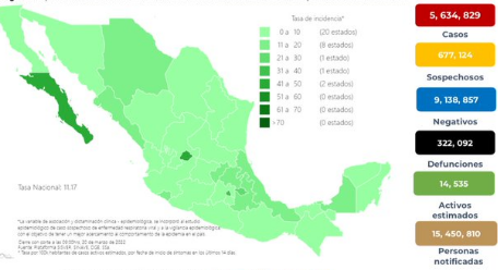 La dependencia dio a conocer que Los decesos por Covid-19 se elevaron a 322 mil 092 y los contagios a 5 millones 634 mil 829.