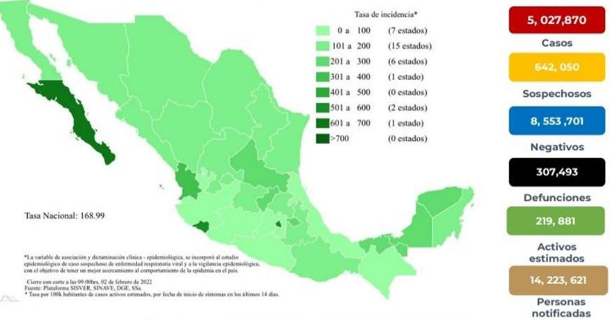 Ciudad de México, a 2 de febrero de 2022.-La secretaría de Salud Federal reportó 42 mil 181 casos de Covid-19, con lo que suman 5 millones 27 mil 870.
