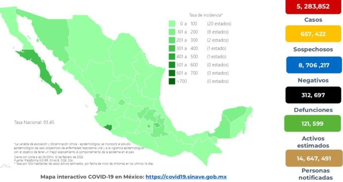 Ciudad de México, a 12 de febrero de 2022.-En las últimas 24 horas, México registró un total de 26 mil 247 casos nuevos de Covid-19 y 579 defunciones, informó la secretaría de Salud Federal.