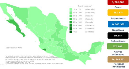 La secretaría de Salud Federal informó que se reportaron también 34 mil 261 nuevos contagios; por tanto, el acumulado aumentó a 5 millones 226 mil 269.