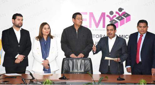 Tras la Firma de Intención de la Candidatura Común, los dirigentes partidistas acudieron al Instituto Electoral de Michoacán, IEM, donde entregaron al consejero presidente, Ignacio Hurtado Gómez, el documento que formaliza la voluntad del Acción Nacional, del Revolucionario Institucional y del PRD, de caminar aliados de cara al 2 de junio de 2024.