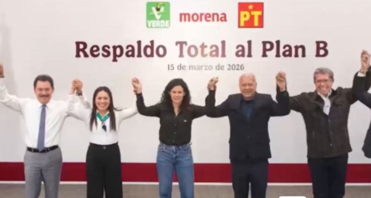 Ciudad de México, a 15 de marzo de 2026.-Los dirigentes y coordinadores parlamentarios de Morena, del Partido del Trabajo (PT) y del Partido Verde Ecologista de México (PVEM) difundieron un mensaje conjunto en el que expresaron su apoyo al plan B de reforma electoral impulsado por la presidenta Claudia Sheinbaum y señalaron que la propuesta representa un paso importante para fortalecer la democracia y eliminar privilegios en el uso de recursos públicos.