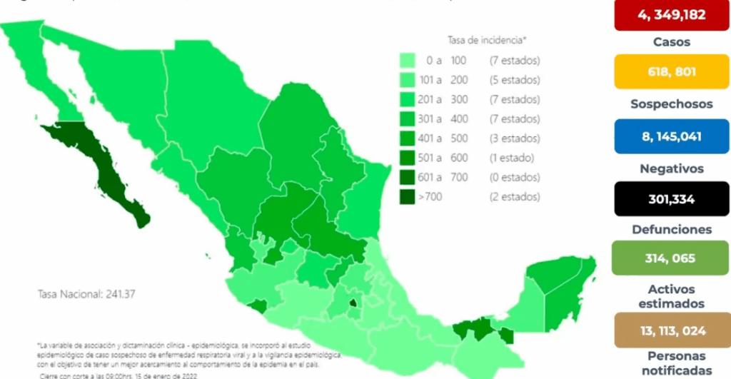 Ciudad de México, a 15 de enero de 2022.-La secretaría de Salud Federal reportó otros 47,113 casos confirmados de Covid-19, la cifra máxima registrada en un día, para un total de 4,349,182.