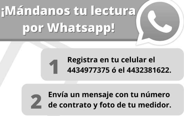 2. Enviar un mensaje vía Whatsapp a cualquiera de los números señalados con los siguientes datos: número de contrato (los 6 números que aparecen en la parte superior derecha del recibo de agua) y una foto clara del reloj medidor, donde se aprecian los números de la lectura.