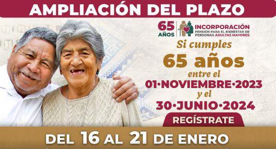 Ciudad de México, a 15 de enero de 2024.-La secretaria de Bienestar, Ariadna Montiel Reyes, informó que se amplía el plazo del 16 al 21 de enero para el registro a la Pensión para el Bienestar de las Personas Adultas Mayores a quienes cumplen 65 años entre el 1° de noviembre de 2023 y el 30 de junio de 2024.