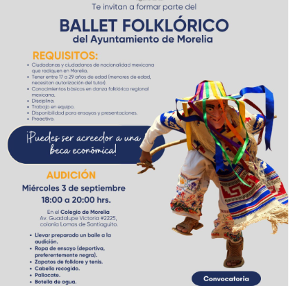 Morelia, Mich., a 26 de agosto de 2025.-El Gobierno de Morelia que encabeza el presidente municipal, Alfonso Martínez Alcázar, por medio de su Secretaría de Cultura (SeCultura) invita a personas de entre 17 y 29 años a sumarse al Ballet Folklórico del Ayuntamiento, con el objetivo de la administración por promover y fomentar la cultura, las tradiciones mexicanas y la danza.