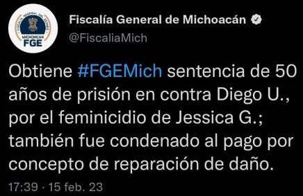 Morelia, Mich., a 15 de febrero de 2023.-La Fiscalía General del Estado de Michoacán (FGE) acreditó en Juicio Oral, los presupuestos de la responsabilidad penal de Diego U., en el feminicidio de Jessica González Villaseñor, que derivaron en la obtención de una sentencia de 50 años de prisión y pago por concepto de reparación del daño, penalidad máxima en la ley vigente en la fecha en que ocurrieron los hechos.