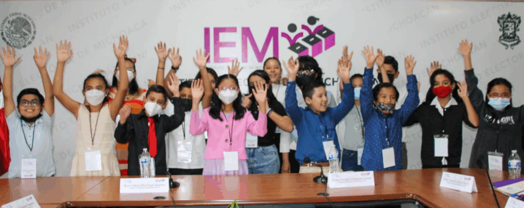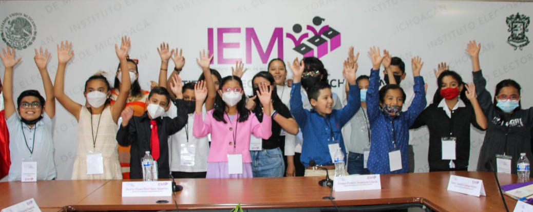 Morelia, Mich., a 25 de mayo de 2022.-Con el objeto de promover en la niñez michoacana los procesos de socialización de valores, así como de crear espacios de participación donde puedan recabar sus expresiones para contribuir al desarrollo democrático de la sociedad a partir del reconocimiento de sus derechos, el Consejo General del Instituto Electoral de Michoacán (IEM) realizó la ceremonia de instalación del Consejo Electoral Infantil 2022, integrado por las y los niños ganadores del Concurso de Expresión Infantil, “Conoce Tu Valor”.