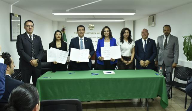 En la signa del evento, también estuvieron presentes Francisco Arroyo Mondragón, titular del Órgano Interno de Control del Tribunal; así como Yurisha Andrade Morales, Yolanda Camacho Ochoa y Salvador Alejandro Pérez Contreras, magistrados integrantes del Pleno.