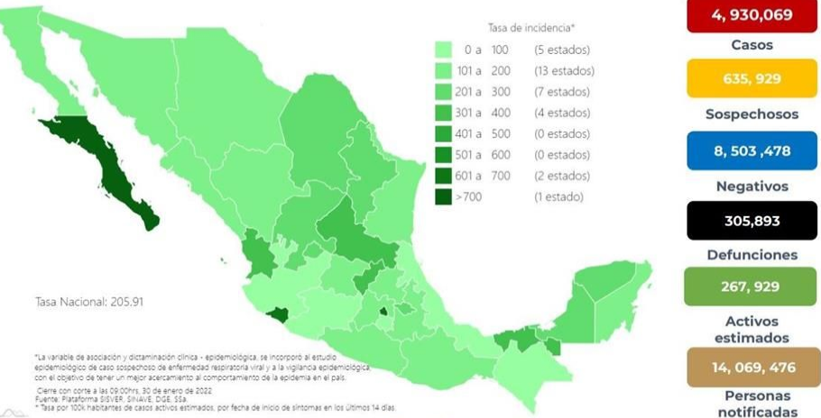 Ciudad de México, a 30 de enero de 2022.-La secretaría de Salud Federal reportó 13 mil 926 casos más de Covid-19, para un total de 4 millones 930 mil 69.