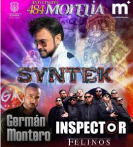 A los éxitos internacionales del pop de Aleks Syntek, también se sumará el ska de Inspector, así como el estilo regional mexicano de Germán Montero y Felinos, teniendo así un concierto que celebrará por todo lo alto el aniversario de Morelia en pleno corazón de la ciudad.
