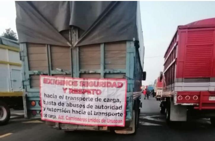 Morelia, Mich., a 18 de septiembre de 2023.-Esta mañana decenas de operadores de transporte de carga con sus unidades de trabajo bloquean las salidas de la ciudad de Uruapan, para denunciar abusos por parte de las corporaciones policiales y robos de los que son víctimas.