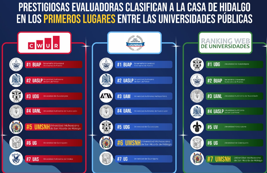 Por lo que respecta al ranking europeo de Webometrics, en su primer reporte semestral del 2022, coloca a la Universidad Michoacana de San Nicolás de Hidalgo (UMSNH) en el lugar 7 de universidades públicas estatales con altos estándares de calidad, divulgación y transparencia en la información que maneja.