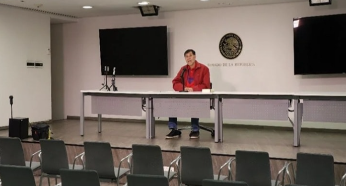 Los reporteros, los camarógrafos y los corresponsales acreditados no estuvieron presentes, solo las cámaras institucionales del Senado grabaron al legislador hablando frente a un atril vacío.